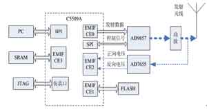 从图1可以看出,DSP是核心控制单元;AD9857用于发射数据,进行上变频,并输出模拟数据到功放,再经过天线发射出去,AD9857的控制信号由DSP的SPI接口实现。AD7655负责采集功放的正向和反向电压值,将电压值回送到DSP,DSP根据电压值进行功放控制。SRAM存储发射的基带数据,以及实时计算发射基带数据的中间变量。Flash保存DSP所需要的程序,供DSP上电调用;DSP和PC之间使用HPI口,使用PCI桥芯片,实现和PC的连接。DSP对AD9857、AD7655、SRAM以及Flash都是经过DSP的EMIF接口连接,EMIF接口是DSP的外部存储器接口(External Memory Interface),可以方便的和外部Flash、异步SRAM等设备连接。本系统的外部设备数据通信速率均较低,最高数据传输速率为AD9857的48Mb/s,C5509A的EMIF接口适合满足其速度要求。