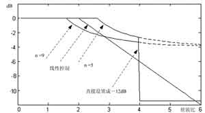根据上面的讨论,功放输出额定功率受限于功放的PF_Full/PR_Full的比值n。在一定驻波比情况下,功放是无法输出额定功率的,例如,驻波比为3,n为3无法输出额定功率。此时,功放能够输出的功率将小于额定功率,但可以输出的最大功率是多少呢?根据式(5),图2画出了功率控制曲线图。图中设定输出额定功率为0dB,为了比较,图中给出了n=9和n=5以及线性控制方法的曲线。