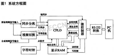 这种字符叠加器的系统方框图如图1所示。图中CPLD采用ispLSI1016,完成地址生成、总线切换、并串转换、地址锁存等核心功能。外围器件还包括微控制器、显示缓存RAM" title="RAM">RAM、以及RS-232串口电平转换芯片等。