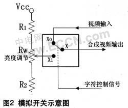 其中,字符时钟提供CPLD固定的时钟信号,以保证CPLD在一定的时序下正常工作,并产生视频叠加所需的各种信号。微控制器采用AT89C52,其在场同步脉冲的外中断触发下,在视频信号回扫消隐期间,接收上位PC机通过串口下传的字符信息,写入显示RAM中。也可根据上位PC机的指令将固化在其内部FLASH ROM中的点阵字符信息直接写入显示RAM中。场、行同步脉冲是字符显示的基准,所以输入的视频信号先经同步分离电路分离出场、行同步脉冲。视频同步分离器采用LM1881,该芯片能够分离出PAL、NTSC、SECAM制式视频信号中的复合同步信号、场同步信号、消隐信号、奇偶场信号。此芯片也适用于非标准的视频信号。视频切换是将两路视频信号合成为一路视频信号,若对于数字信号可采用数据选择器,但对于模拟信号来说,只能采用模拟开关,其原理如图2所示。当没有字符控制信号的时候,将视频输入X0和输出X短路,即视频信号直通,若此时字符控制信号输入端有字符信号时,则将输出端X与可调节的固定电平X1相连。本设计中采用的是CD4066,显示缓存RAM采用普通的8位RAM。RS-232串口电平转换采用MAX232。