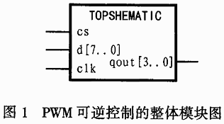 为了实现直流伺服系统的H型单极模式同频PWM可逆控制,一般需要产生四路驱动信号来实现电机的正反转切换控制.当PWM控制电路工作时,其中H桥一侧的两路驱动信号的占空比相同但相位相反,同时随控制信号改变并具有互锁功能;而另一侧上臂为低电平,下臂为高电平.另外,为防止桥路同侧对管的导通,还应当配有延时电路.设计的整体模块见图1所示.其中,d[7:0]矢量用于为微机提供调节占空比的控制信号,cs为微机提供控制电机正反转的控制信号,clk为本地晶振频率,qout[3:0]矢量为四路信号输出.其内部原理图如图2所示.