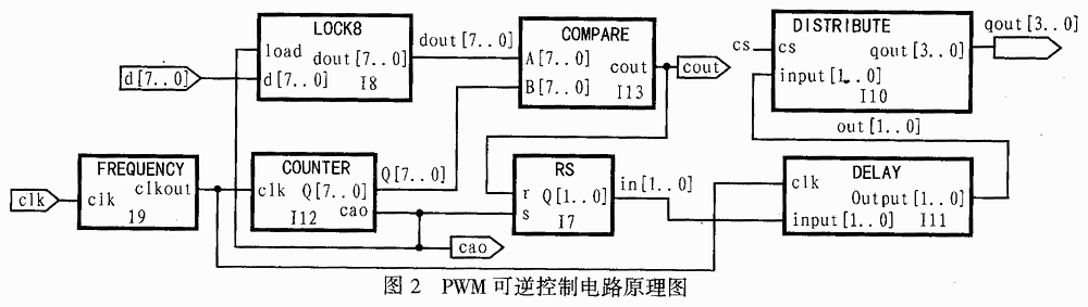该设计可得到脉冲周期固定(用软件设置分频器I9可改变PWM开关频率,但一旦设置完毕,则其脉冲周期将固定)、占空比决定于控制信号、分辨力为1/256的PWM信号.I8模块为脉宽锁存器,可实现对来自微机的控制信号d[7:0]的锁存,d[7:0]的向量值用于决定PWM信号的占空比.clk本地晶振在经I9分频模块分频后可为PWM控制电路中I12计数器模块和I11延时模块提供内部时钟.I12计数器在每个脉冲的上升沿到来时加1,当计数器的数值为00H或由0FFH溢出时,它将跳到00H时,cao输出高电平至I7触发器模块的置位端,I7模块输出一直保持高电平.当I8锁存器的值与I12计数器中的计数值相同时,信号将通过I13比较器模块比较并输出高电平至I7模块的复位端,以使I7模块输出低电平.当计数器再次溢出时,又重复上述过程.I7为RS触发器,经过它可得到两路相位相反的脉宽调制波,并可实现互锁.I11为延时模块,可防止桥路同侧对管的导通,I10模块为脉冲分配电路,用于输出四路满足设计要求的信号.CS为I10模块的控制信号,用于控制电机的正反转.