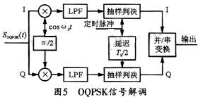 OQPSK信号可采用正交相干解调方式解调,其解调原理如图5所示。由图5可以看出,OQPSK与QPSK信号的解调原理基本相同,其差别仅在于对Q支路信号抽样判决时间比I支路延迟了Tb/2,这是因为在调制时,Q支路信号在时间上偏移了Tb/2,所以抽样判决时刻也相应偏移了Tb/2,以保证对两支路的交错抽样。