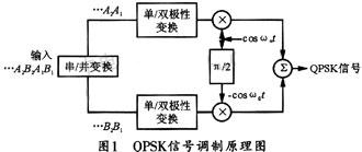 QPSK信号有00、01、10、11四种状态。它对输入的二进制序列首先必须进行分组,每两位码元一组。然后根据组合情况,用载波的四种相位表征它们。QPSK信号实际上是两路正交双边带信号,可由图1所示的方法产生。