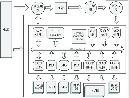 主控系统的核心FPGA采用Altera公司Cyclone系列的EP1C6T144C8。CPU即为Nios II软核处理器,对整个系统进行统一管理。折线框内为主控板,除下载、调试用的PC机外,对直流电机及主控板需单独供电。直流电机工作后将气流送至面罩内,电机根据端的信号来调节气流的大小。在面罩内装有压力检测模块,通过A/D转换返回至主控板,用来对气流进行回馈调节。面罩供患者使用。