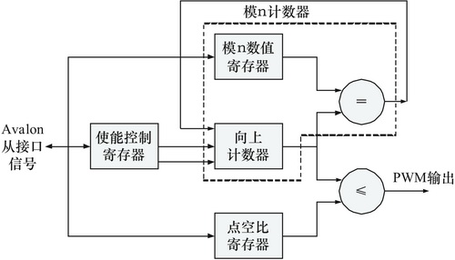 系统使用PWM信号对直流电机进行控制。在SOPC Builder提供的标准IP核中是没有PWM组件的,需要自行定制,PWM组件的输出信号是方波,方波的周期及占空比可调。PWM任务逻辑结构示于图2。