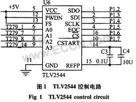 来自传感器的模拟信号,在送入模拟数字转换电路之前,由于器件的输入阻抗比较低,而传感器的输出阻抗较高,不能直接把模拟信号送入模拟数字转换电路。本文采用TLC279构成电压跟随器,实现阻抗变换。考虑到在FPGA实现的算法处理对数据的精度敏感,因此,系统选用了四路模拟量输入的12 bit串行数据输出的TLV2544作为模拟数字转换电路的核心芯片。
