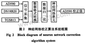 本文采用三层前向网络,输入层神经元2个,分别代表温度传感器ADS90和气体传感器TGS813输入信号,DS18B20的测量值作为AD590的期望值,输出层神经元1个,代表AD590的校正值。