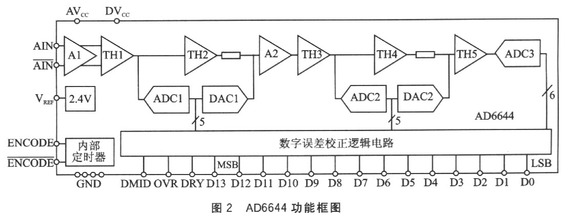 AD6644采用三级子区式的转换结构,既保证了精度又降低了功耗,其功能框图如图2所示。它的模拟信号输入方式是差分结构,每个输入的电压以2.4V为中心,上下范围在0.55V以内。由于两个输入的相位相差180°,所以AD6644的摸拟输入信号的最大峰一峰值为2.2V。由图2可以看出,差分模拟输入端先经过缓冲后进入第一个采样保持器(THl)。当编码时钟为高时,THl进入保持状态。TH1内保持的值作为粗的5位ADCl的输入。ADCl的数字输出驱动一个5位数/模转换器DACl。DACl要求具有通过激光校正的14位精度。延迟的模拟信号与DACl的输出相减,产生第一剩余信号,并送给采样保持器TH3。采样保持器TH2的作用是延迟,为补偿ADCl的数字延时提供了模拟延时,使送入TH3的两路信号同时到达。