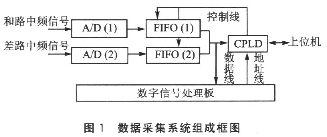 系统中,和路和差路中频信号都是模拟中频信号,经过A/D芯片将模拟信号变成数字信号,再经过FIFO芯片,将采集到的数据送入数字信号处理板。数字信号处理板中的处理器是DSP。DSP的数据线和2片FIFO的数据线连接,同时也和CPLD连接,地址线和CPLD连接。2片FIFO芯片的读写控制逻辑由1个CPLD进行控制。CPLD与上位机的数据线、地址线连接,数字信号处理板通过CPLD和上位机通信。