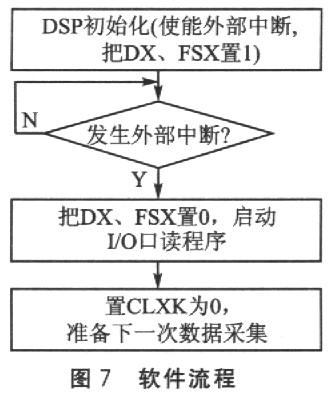 软件设计包括CPLD和DSP两个部分。CPLD程序用VHDL语言编写,实现简单的逻辑转换功能,程序设计比较简单。DSP编程中有几个关键步骤:外部中断使能、时钟送入A/D转换器和FIFO、等待中断、停止A/D转换器和FIFO、采集数据、复位FIFO。整个软件流程如图7所示。