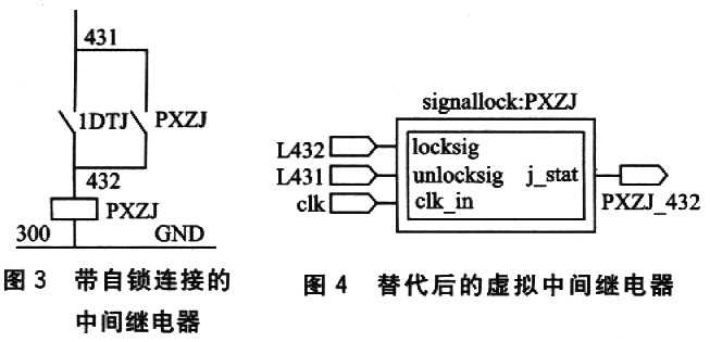 获取继电器的状态即通过检测与继电器关联的线号的得失电状态,经过与之对应的逻辑组合得出继电器是否得电;得到的继电器状态构成继电器状态表,供后级电路查询。以最基本的自锁连接的中间继电器来说明,其示意图如图3所示,替代后的虚拟继电器如图4所示。