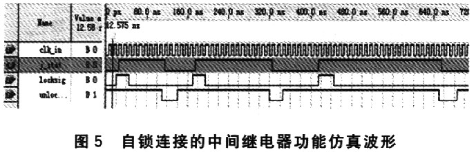 替代后的中间继电器采用通用的模块化设计。在具体应用过程中只要调用这些继电器模块,按原继电器连接信号进行端口定义就可以方便的使用。自锁连接的继电器功能仿真如图5所示,其端口定义和Verilog HDL实现如下: