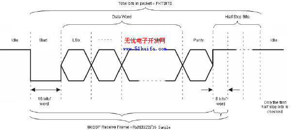 数据包(PKTBITS)由起始位、数据位、奇偶校验位和停止位组成,起始位为1位,停止位通常为1,1.5,2位,数据数通常为8位,如何使用校验,那么数据包还包括1位校验位。以上数据位中,每1位都被DSP以16倍波特率的时钟频率过采样。