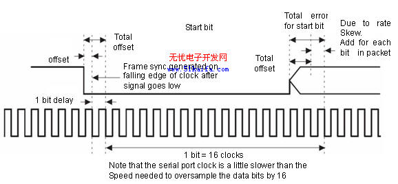 异步串行通信要求DSP能够模拟和检测到UART的帧信号。由于DSP串口是同步串口,而且DSP时钟为高速时钟,经分频或倍频后无法保证与UART的异步串行时钟精确同步。DSP的帧同步信号无法与UART的帧信号同步,造成串行通信信号中信号位的偏移。最好的解决方法是减小偏移和对接收的数据流进行过采样,本文采用了对UART信号的16倍过采样。www.51kaifa.com/