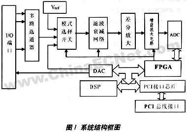整个采集卡包括信号调理、数据采集、数据处理和总线接口设计。系统结构如图1所示。