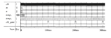 FPGA根据N对时钟脉冲分频计数,分为偶数和奇数的两种情况,N为偶数时比较容易实现,当N为奇数时,需要设置两个分频器,分别对时钟脉冲的上升和下降沿计数,再将这两个结果作逻辑或处理,即可得到结果为(freq×duty)的方波脉冲,再对其进行值为duty的不等分频处理,所得到的就是频率和占空比满足要求的结果。图3是仿真结果,其中m为所要实现的频率freq,n为占空比, temp2为频率为freq×duty的方波信号, clk_gate就是最终的栅极信号。其中时钟clk为2MHz,m为10Hz,n为1/20。