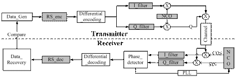 整个系统可以分为两大部分:发送部分和接收部分。在发送端通过信源模块产生数据,送入RS编码模块进行编码,然后进行DQPSK调制并发送;接收端将接收到的信号进行DQPSK解调、RS解码后输出。系统流程图如图1.