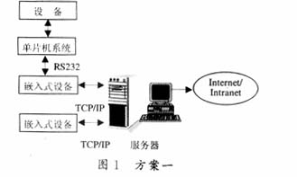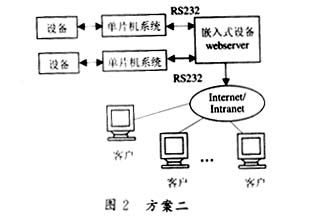 该远程控制系统利用Internet/Intranet网络资源,只需一台联网的PC客户机,就可实现对远程设备状态的监视和控制。这里,我们提出系统结构的两种设计方案,如图1、2所示。