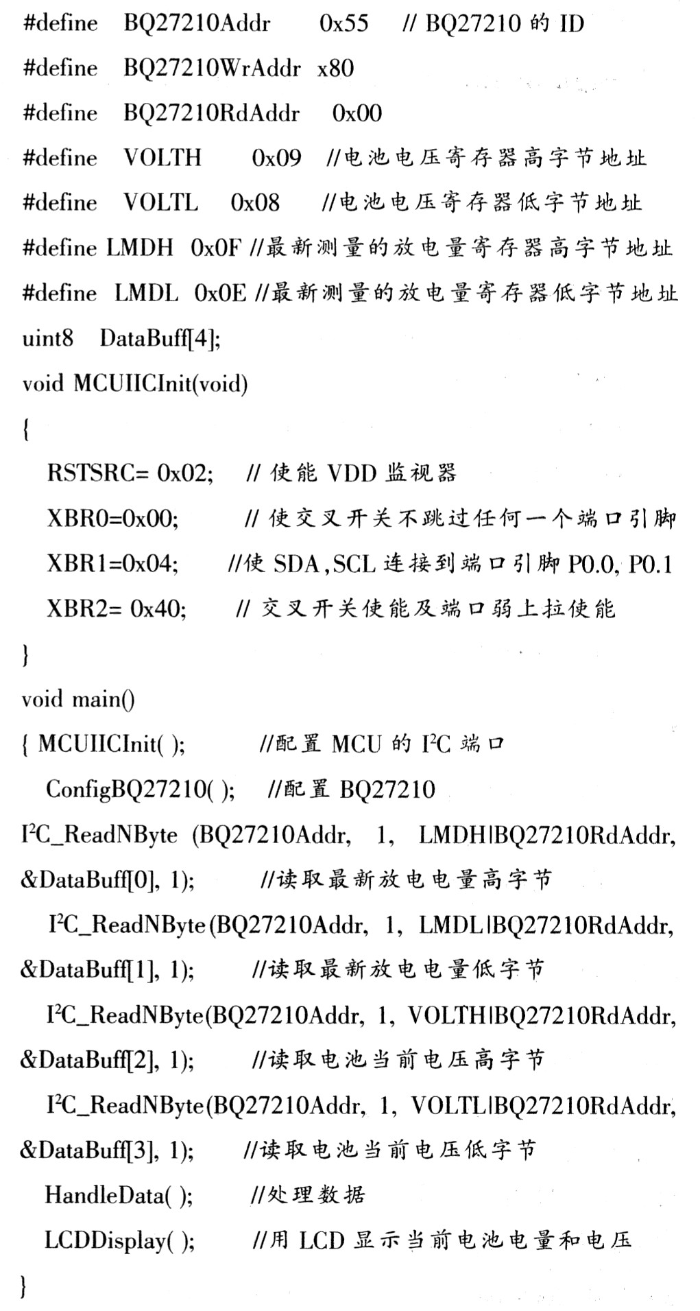 现给出单片机C805lF304通过I2C总线协议读取BQ272lO内部RAM存放的最新电池放电量和电池电压信息的部分程序代码:
