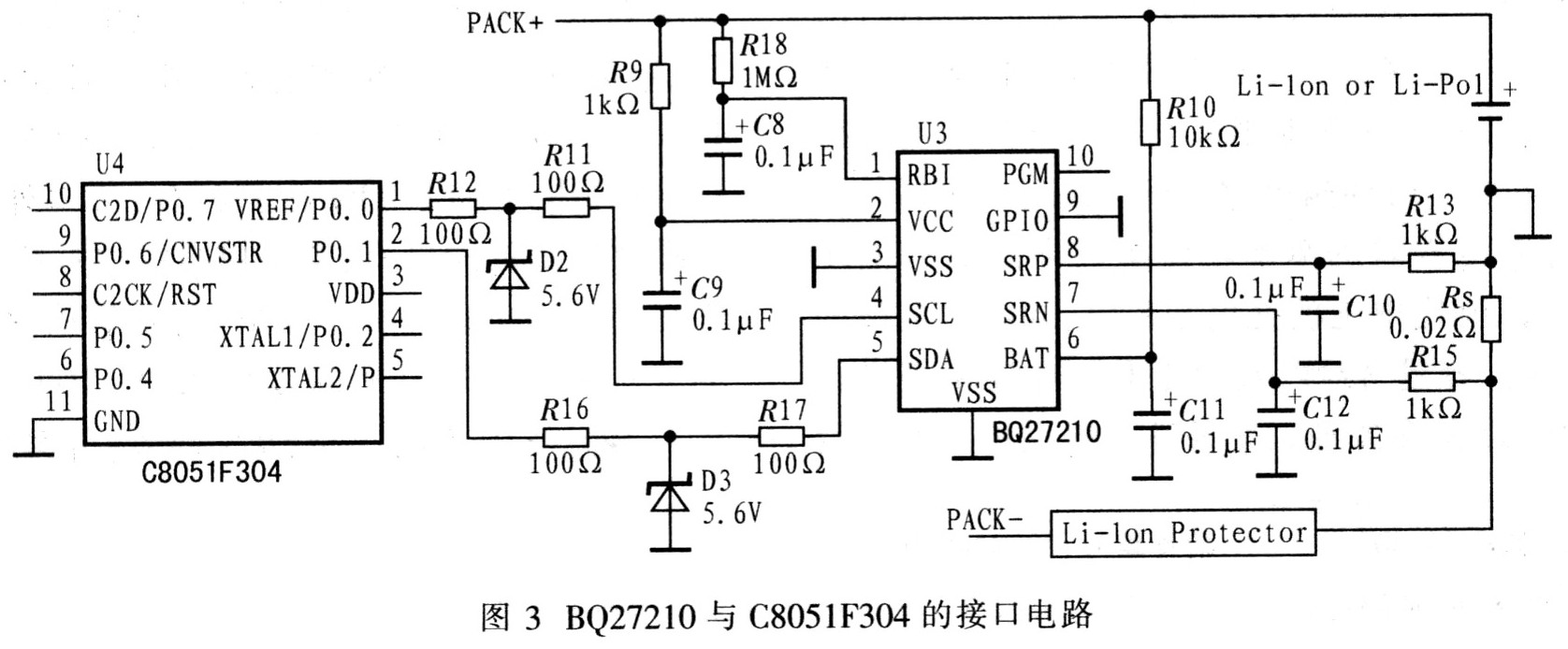 C805lF304的P0.0和P0.1端口与BQ272lO的SCL和SDA引脚相连接,通过I2C总线实现数据传输,以用于单片机控制电路对电池充放电状态的查询或中断处理,同时利用该串行接口电路还可以读、写操作BQ27210中的各个内部寄存器,读出所需的电池信息。