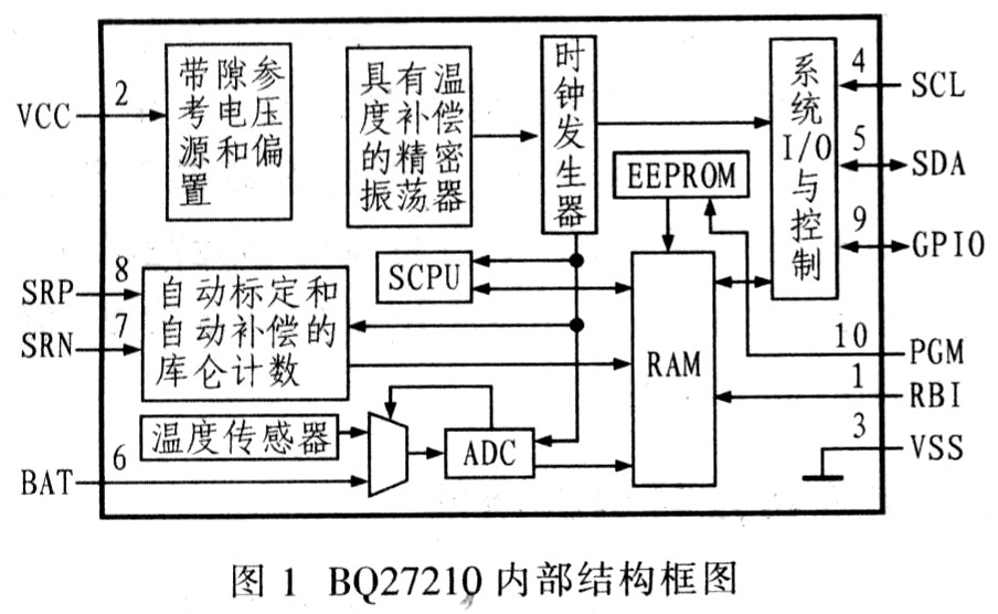 BQ27210的内部结构框图如图l所示。该器件可将计算得到的与电池充放电相关的数据存放在内部RAM中,这些数据可通过RBI上的电压予以保持,而EPPROM则用以保存永久性的用户数据信息。由于BQ27210内部集成有A/D转换器和温度传感器,因此要获得电池的电压、温度等参数,只需通过外部处理器对器件发出采集电压和温度控制命令即可,当芯片采样完毕后会自动将电压、温度测量值存入相对应的RAM寄存器中,再由外部处理器读取寄存器的内容。