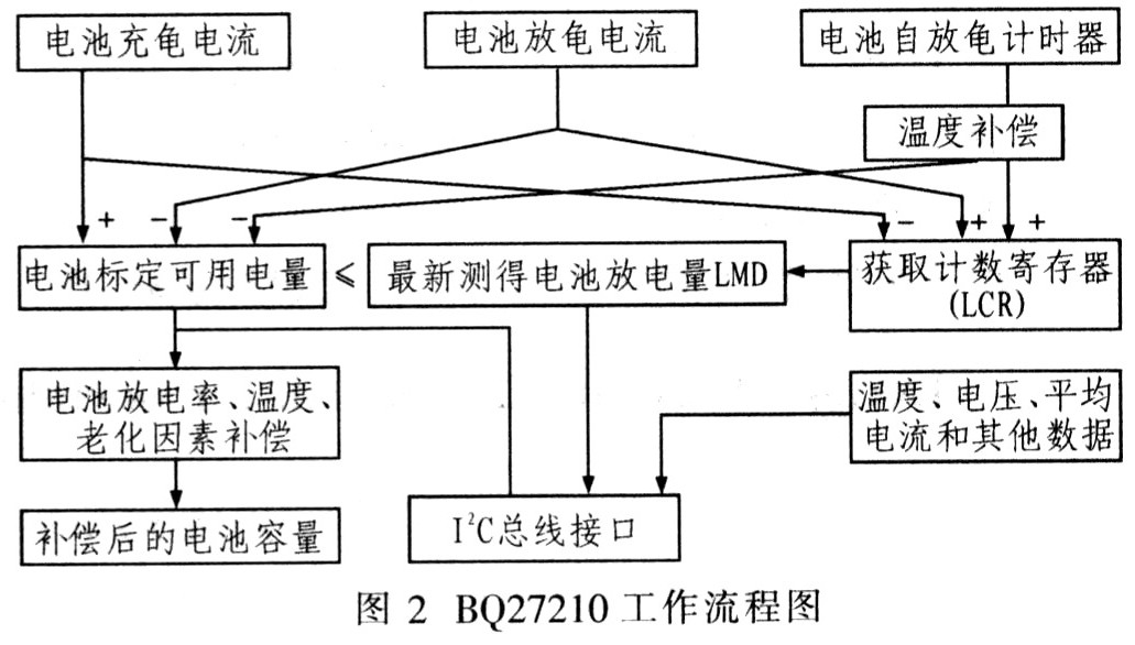 该芯片的最大的特点是在电池使用过程中能够实时监测电池的电量,并根据最新监测的电池电量值来更新RAM中寄存器LMD(电池最新放电电量)的参数,同时BQ27210还能保留更新后的参数,并将其存放在寄存器LMD中直到寄存器复位。在整个电池充电到放电终止过程中,BQ27210就是通过这种不断地监测并更新来获取电池电量相关的实时参数。BQ27210的工作流程如图2所示。