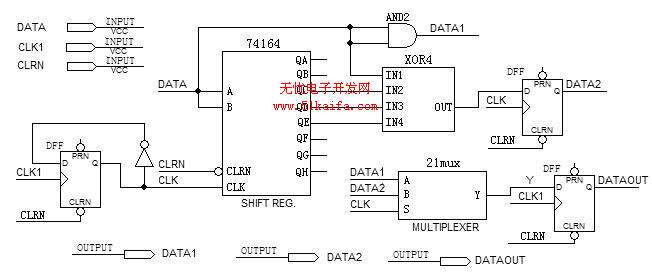 5级移位寄存器从MAX+PLUS2器件库中调用一个串入并出移位寄存器74164实现;4级模2加从MAX+PLUS2器件库中调用一个4级异或门“XOR4”组成;“21mux”实现2位并串转换;编码器的两个输出码和并串转换后的输出码之后各增加了一个D触发器“DFF”,其作用是利用D触发器的输入端对毛刺信号不敏感的特点,去处CPLD器件输出引脚上可能产生的毛刺。