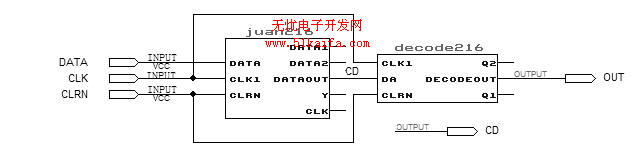 2位串/并转换“chuanbing12”是从MAX+PLUS2器件库中调用4个D触发器“DFF”,2个非门设计成一个二分频电路和一个一输入二输出串/并转换电路并进行元件包装入库而形成,其中时钟CLK由CLK1二分频得到。