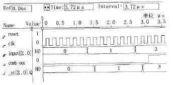 利用Altera公司的EDA工具软件MAX+plus对用VHDL语言设计的状态机进行时序仿真,仿真波形如图4所示。