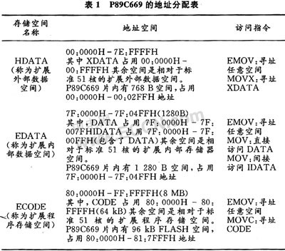 P89C669的存储器结构为哈佛结构,地址分配如表1所示。