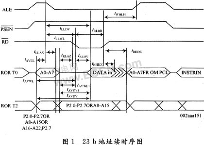 寻址8 MB的数据存储空间,需要有23 b的地址寻址能力,P89C669将传统51内核的P2高位地址时分复用,从而得到23 b地址寻址能力,时序图如图1所示,即当使用23 b地址时,ALE为高时,地址位A16~A22输出到P2.0~P2.6;ALE为低时,地址位A8~A14输出到P2.0~P2.6。无论ALE为何值,位地址A15都从P2.7输出。