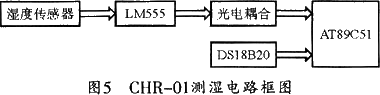 CHR-01湿度探测振荡电路由电阻型高分子膜湿敏电阻、LM555集成芯片及相关的电子元件组成,并采用AT89C51单片机作为处理器。由于高分子湿敏元件的电阻会随着环境湿度的变化,因而该振荡电路会产生不同的振荡频率。将该信号通过光电耦合和接口元件传送到单片机的计时器中,就可完成信号采集。图5所示是CHR-01测湿电路结构框图。