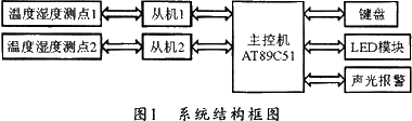 本方案以AT89C51单片机系统为核心来对温度、湿度进行实时控制和巡检。各检测单元(从机)能独立完成各自功能,并根据主控机的指令对温度进行实时或定时采集。测量结果不仅能在本地储存和显示,而且可通过RS-485总线及通信协议将采集的数据传送到主控机。以便进行进一步的分析、存档、处理。主控机负责控制指令的发送,并控制各个从机进行温度采集,收集测量数据,同时对测量结果(包括历史数据)进行整理、显示和打印。主控机与各从机之间能够相互联系、相互协调,从而达到系统整体统一和谐的控制效果。图1所示是本系统的结构框图。