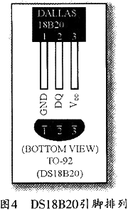 在DS18B20中,DQ为数字信号输人/输出端;GND为电源地;VDD为外接供电电源输入端。图4是DS18B20的引脚排列图。