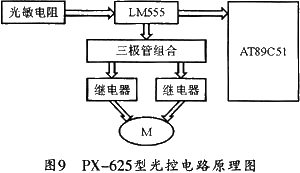 PX-625型光控电路由电阻型薄膜光敏电阻、LM555集成芯片及相关的电子元件组成,它利用三极管的导通和截止来控制电动机的正反转,并将控制信息传给单片机。图9所示是PX-625型光控电路原理图。