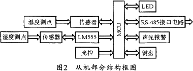 图2所示是该系统从机部分的结构框图。该方案采用数字式DS18B20作为温度传感器,该芯片在采集温度信号时,具有大范围、高精度、数字量输出的特点。CHR-01湿度传感器采集的信号可利用LM555振荡器将电流信号转化成频率信号。选用CHR-01国产元件主要是其价格便宜。