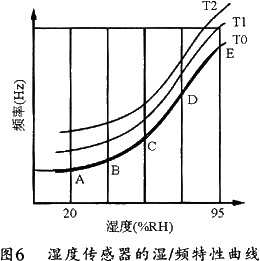 由于不可能事先测定每个标准湿度值所对应的频率值(那样会大大增加工作量,并且也没有必要),所以只对其中某些特定的湿度值进行测量和记录即可。比如在图6所示的湿度传感器特性中,实际的湿度/频率曲线T0(如图6所示)在应用中只需标定A、B、C、D、E五个点的标准值,然后运用数值方法来实现对AB、BC、CD、DE各区间段湿度的近似测量。在此需要强调的是,由于湿敏元件的阻抗是随着温度变化的,这会导致不同温度下的不同湿度/频率曲线(如T1℃下对应的曲线T1;T2℃时对应的曲线T2),故要分别对不同温度下的湿/频曲线进行测定。