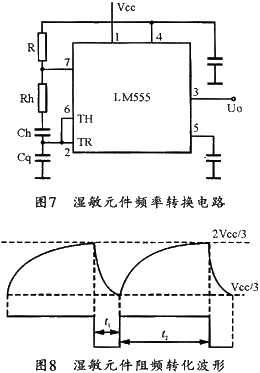 本传感器振荡电路的参数最优化问题是指选择合适的电子元件(Cq和R)来保证湿度传感器的灵敏度和测量数据的单调性。高分子湿敏元件与LM555组成的振荡电路如图7所示。经研究表明,湿敏元件的等效电阻电容混合复杂二端网络在一定频率下可等效为电阻与电容串联结构(如图7所示的Rh和Ch)。其中,Uo表示输出电平,Cq微积分电容。该振荡器的振荡包括:放电和充电两个过程。当送入电压VCC时,Ch和Cq的总压降为零,TR和TH端口电压均小于VCC/3,输出端Uo为高电平1。电源通过电阻R对Ch和Cq充电,以使TH和TR口电压Uo逐渐升高。当其升高到2VCC/3时,LM555内部发生翻转使输出端变低,此后LM555定时器内的放电管导通。Ch和Cq通过Rh和放电管放电。当TR和TH端口电压下降到VCC/3时,输出端又变高。其输出波形如图8所示。若湿敏电阻选CHR-01则R可取2 kΩ,Cq取68 pF。
