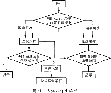 从机程序主要由温/湿度信号采集程序、光控指示程序、报警程序、温度存储程序和响应主机命令程序组成,该从机采样流程图如图11所示。从机响应主机的程序实际上是一个中断处理程序。从机在工作过程中,当检测到主机发送来的命令时,它将停止温度信号采集程序,转而去响应主机的请求。主机命令或请求有以下四种:报警查询、设置从机时间、设置报警阈值和巡检温度。