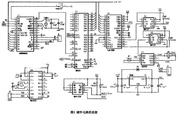 电路中使用的微处理器是ATMEL公司生产的AT89C51型单片机,硬件连接如图3所示,USBN9603的CLKOUT与AT89C51的XTAL1相连,USBN9603的时钟输出为AT89C51提供时钟输入。AT89C51通过并行地址/数据复用的方式访问USBN9603,AT89C51的P2.0通过74HC14反向后片选USBN9603,其地址为0x00-0x1FF。选用SJA1000作为CAN微控制器,SJA1000集成了CAN协议的物理层和数据链路层功能,可完成对通信数据的帧处理,其地址为0x000-0x0FF。AT82C50作为CAN控制器和物理总线之间的接口,用于提供总线的差动发送能力和CAN控制器差动接收能力。通过AT82C50的引脚3可选择3种不同的工作方式(高速、斜率控制和待机)。该引脚接地为高速方式,高速光耦隔离用6N137实现,其作用是防止串入信号的干扰。MAX232用来完成RS232电平到微控制器接口电路的TTL电平转换,同时还可进行一些总线端口的工作参数设置。