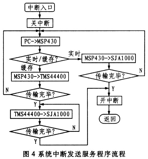 MSP430的内核结构采用具有高透明格式的精简指令(RSIC)设计。CAN信息的接收和发送一样,是由CAN控制器自动完成的,程序只需从相应的缓存器中读取相应的数据,再进行相应的处理即可。在此系统中,单片机完成初始化任务后进入低功耗睡眠状态,任一中断均可将其唤醒,转而执行相应的中断服务子程序。系统的2个中断源分别为PC串口发送和下位机CAN信息接收,这样做的好处是尽可能地避免由于数据超限而引起的数据重发。图3示出系统CAN初始化流程,图4示出发送中断服务程序流程。由于篇幅关系,本文略去接收中断服务程序流程,其流程大致与发送流程相反。