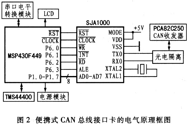 便携式CAN总线接口转换卡的电气结构原理框图如图2所示,它由电源模块、CAN通信接口电路、串口电平转换电路、缓存和LCD模块组成。