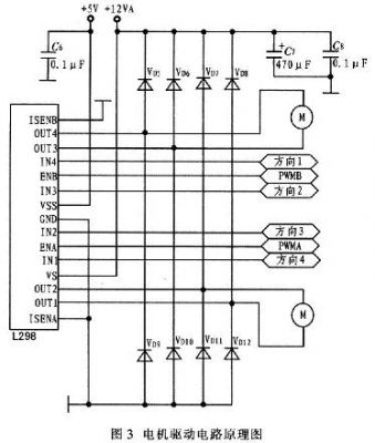 采用L298驱动电机,0UTl,0UT2分别与小车的一个电机的正负极相连;OUT3,OUT4分别与小车的另一个电机的正负极相连;L298的INl和IN2引脚分别与DSP的IOPE0(方向4)、IOPE1(方向3)引脚连接,用于接收主控器件输出的转向电机的动作指令,并通过0UTl和OUT2控制左电机的正转与反转,L298的IN3,IN4引脚分别与DSP的IOPE2(方向2)、IOPE3(方向1)引脚连接,用于接收主控器件输出的驱动电机的动作指令,并通过0U113,OUT4控制前方右电机的正转与反转,而ENA和ENB引脚分别连接到DSP的IOPE0(PWM3)、IOPEl(PWM4)引脚,用于控制电机的速度,