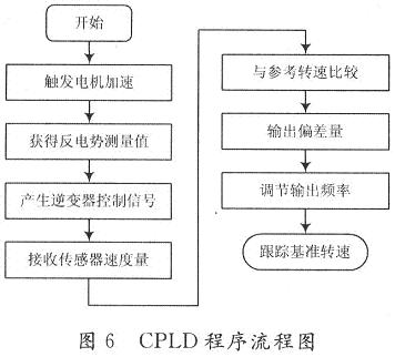 CPLD部分完成电机的换相处理和速度反馈控制功能,采用图形化设计和VHDL语言混合设计完成时序部分的编写。CPLD接收电机绕组反电势,经片内逻辑电路处理,形成4路逆变器的导通控制信号,用以控制电机绕组的加电顺序;通过CPLD内置的数字锁相环74LS297进行锁相处理,完成对电机转速的恒定控制。利用CPLD将锁相环和换相处理电路封装在一起,形成一个完整的速度反馈控制模块。CPLD部分程序流程图如图6所示。