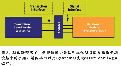 这些适配器可以用SystemC或以SystemVerilog(图3)来编写。使用一项SystemC适配器是相当直接的方式,并且以将SystemC信号映射到SystemVerilog信号为基础,反之亦然。而以SystemVerilog来缩写转换器时,典型情况下能够提供更高的性能,但要求在SystemC与SystemVerilog之间建立事务处理级接口。