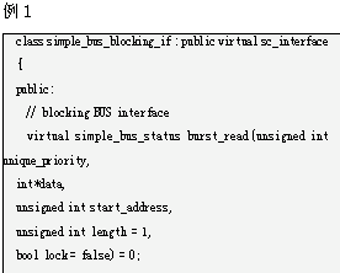 例1所示为在参考文献[3]中所述的以SystemC编写的simple_bus的模块接口部分。它描述了接口方法burst_read。而simple_bus的整个代码可以在任何SystemC 2.x版本的安装版本中找到。但是,simple_bus是如何实现此接口方法的,例如,使用了什么样的总线带宽或使用了哪一类型的仲裁,对于该接口方法的调用者来说都是不可见的,因此,可以在体系结构开发中很方便地进行改变。