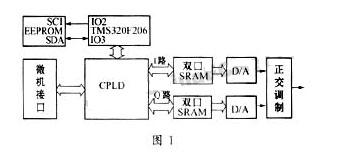 采用波形存储直读法,即通过对存储的波形采样数据进行数模变换,直接生成模拟信号的一种方法。图1为信号源的系统结构。本信号源可工作于联机和脱机两种方式。联机工作时,波形数据从微机加载,由DSP控制,通过CPLD内的数据通道写入SRAM,经回读、校验后,从SRAM内高速送入到数/模转换器件产生雷达信号。脱机工作时,波形数据可在系统上电时由EEPROM加载,EEPROM中可存放一组波形数据,也可存储多组数据以方便应用。