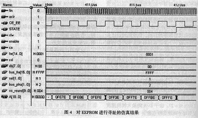 通过上述结构设计可得到顶层电路结构。整个电路设计可采用Verilog语言和原理图输入相结合的方法来设计。图3和图4分别给出了对RAM和EEPROM进行寻址的仿真结果。5 结论