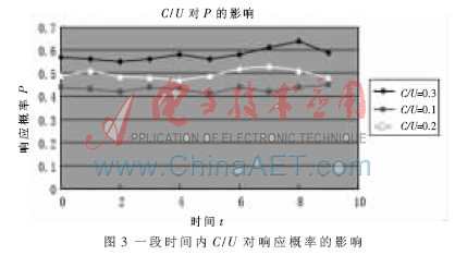 从图3来看,C/U越大,节点响应服务请求的概率也会增大,但是C/U如果太大的话,在实际应用中又会降低系统的总体效率,因此C/U的取值应该根据不同的系统应用来设置,以求达到一个平衡。在实际应用中,如果节点响应服务请求的概率P的平均值能维持在50%左右的话,就基本上是满意的。在图3中α=0.8,β=1。